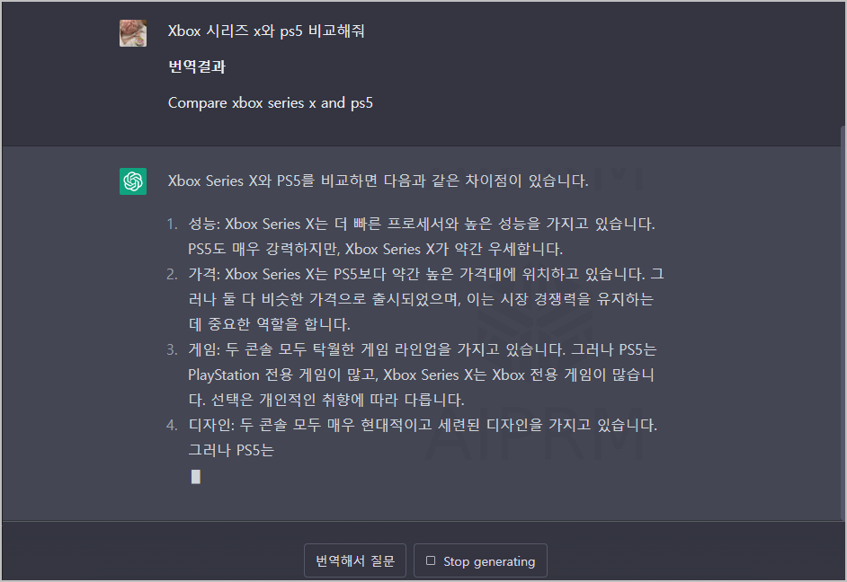 그러면 내 질문을 번역해서 Compare xbox series x and ps5 라고 질문해 주고 답변을 한글로 주는 것을 확인하실 수 있습니다.