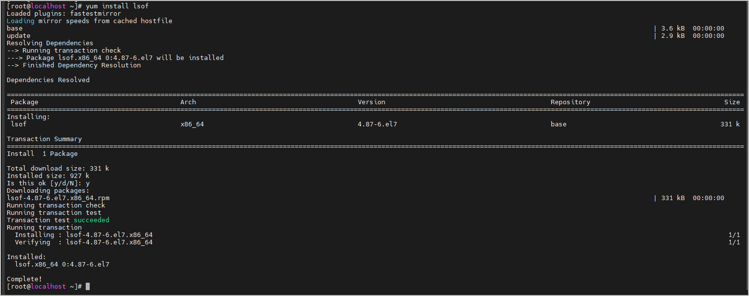 lsof 패키지를 yum을 통해서 다운로드 해줍니다. yum은 repository 설정이 정상적으로 되어 있고, 인터넷이 되는 환경이여야 합니다.