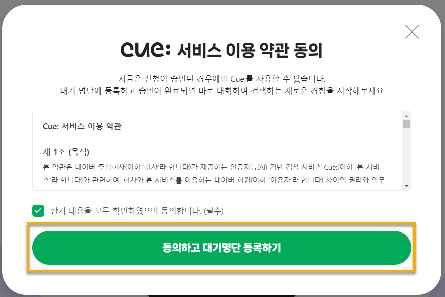 서비스 이용 약관에 동의하고 대기명단 등록하기를 해줍니다.