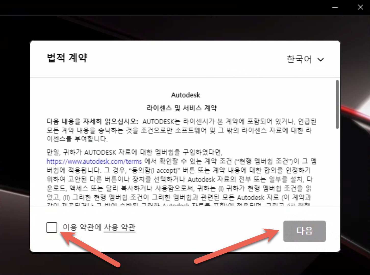 여기서 더 이상 넘어가지 않고 그냥 꺼져버리는 경우에는 다른 Autodesk 프로그램을 제거하시거나 다른 해결 방법을 찾아주셔야합니다.