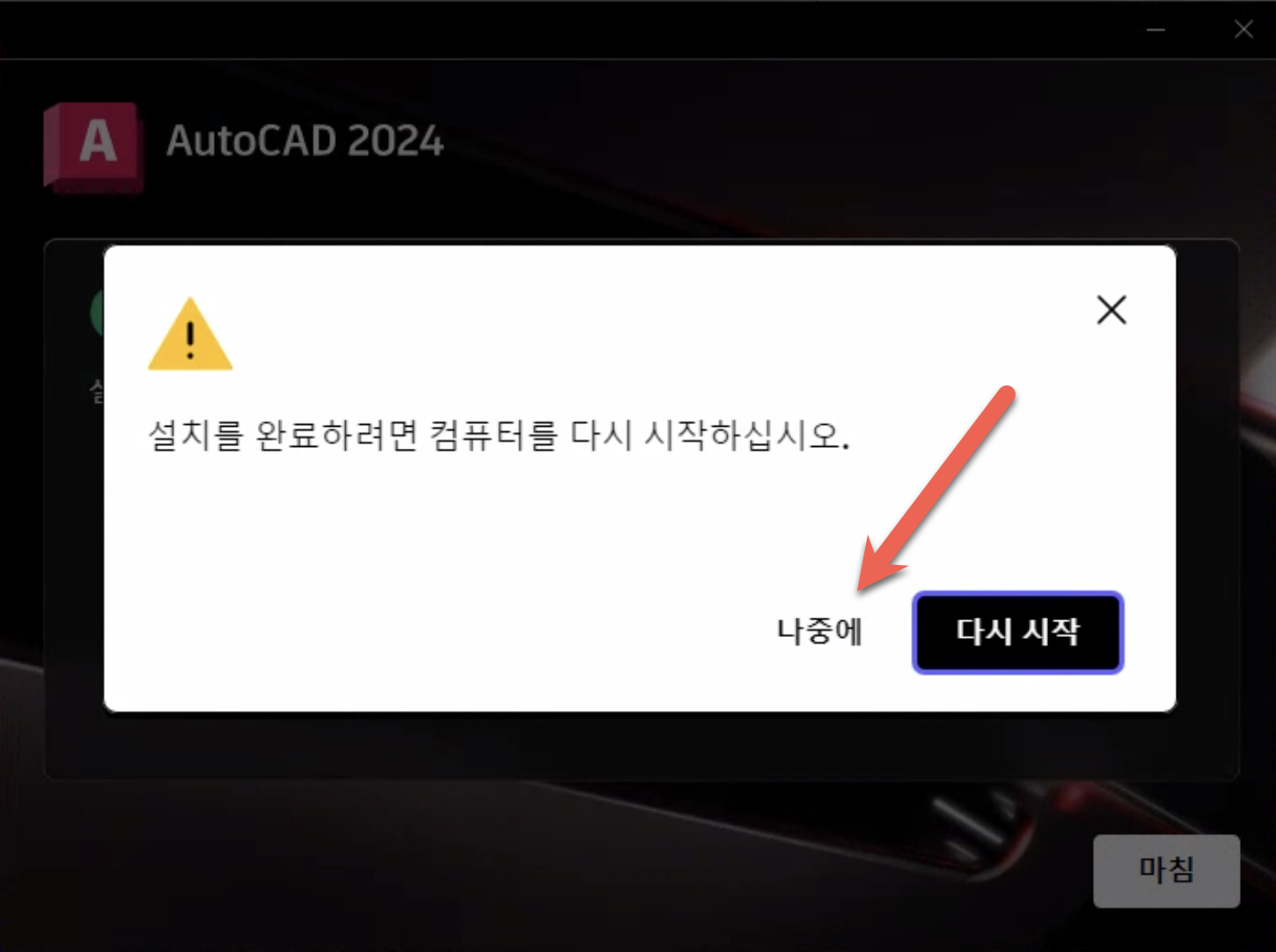 설치가 완료되면 컴퓨터를 다시 시작하라는 메시지가 나오게 되는데, 여기서 다시 시작이 아닌 [나중에]를 클릭해줍니다.