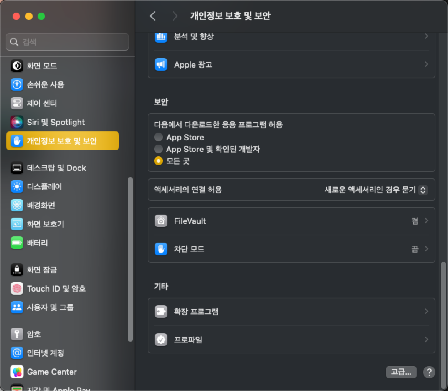 시스템 환경설정 > 개인정보 보호 > 다음에서 다운로드한 응용 프로그램 허용에서 모든 곳을 체크해줍니다. 맥os의 게이트키퍼를 비활성화 해줘야 [모든 곳] 버튼이 생기게 되는데, 이 버튼을 활성화 하는 방법은 아래에서 소개해 드리겠습니다.