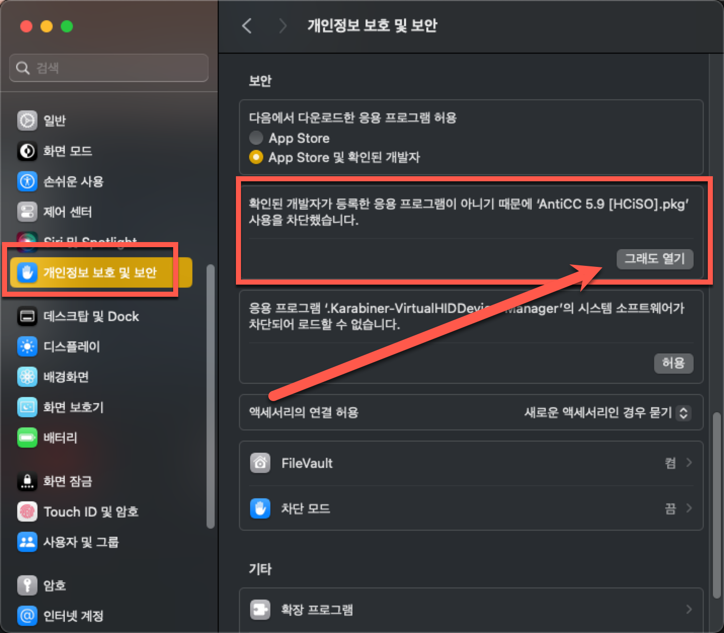 맥os 설정으로 가서 메뉴에서 개인정보 보호 및 보안으로 들어가줍니다.