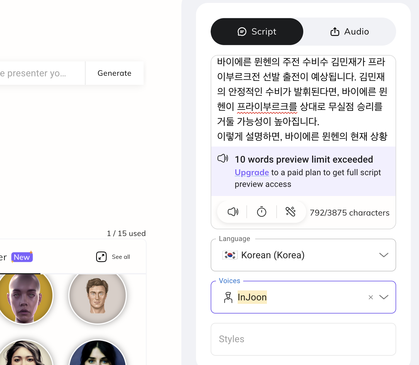 생성 후에는 발표자 아바타를 선택해 주세요, 다양한 스타일 중 하나를 고를 수도있고 직접 만들어 볼 수도 있습니다.