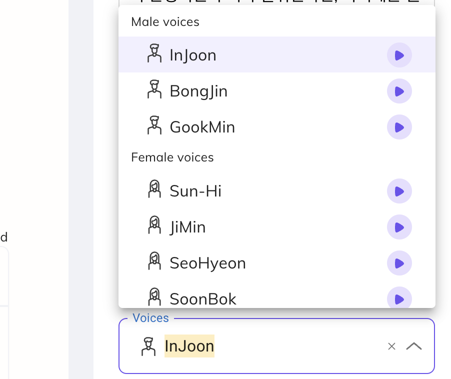 언어를 선택해주시고, Voices에 원하는 목소리 톤을 선택해줍니다. 우측에 재생 버튼을 통해서 샘플 목소리를 들어볼 수 있습니디. 이전에는 성별로 1가지씩만 존재했는데 날이 갈수록 다양한 목소리들이 추가되고 있습니다.