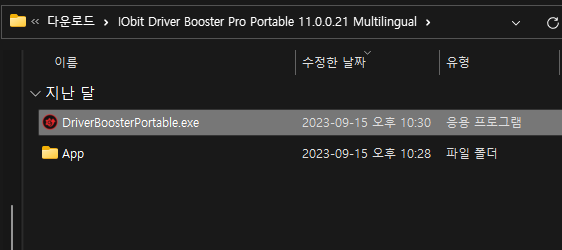 압축 해제한 폴더로 이동해서 DriverBoosterPortable exe 파일을 실행시켜줍니다.