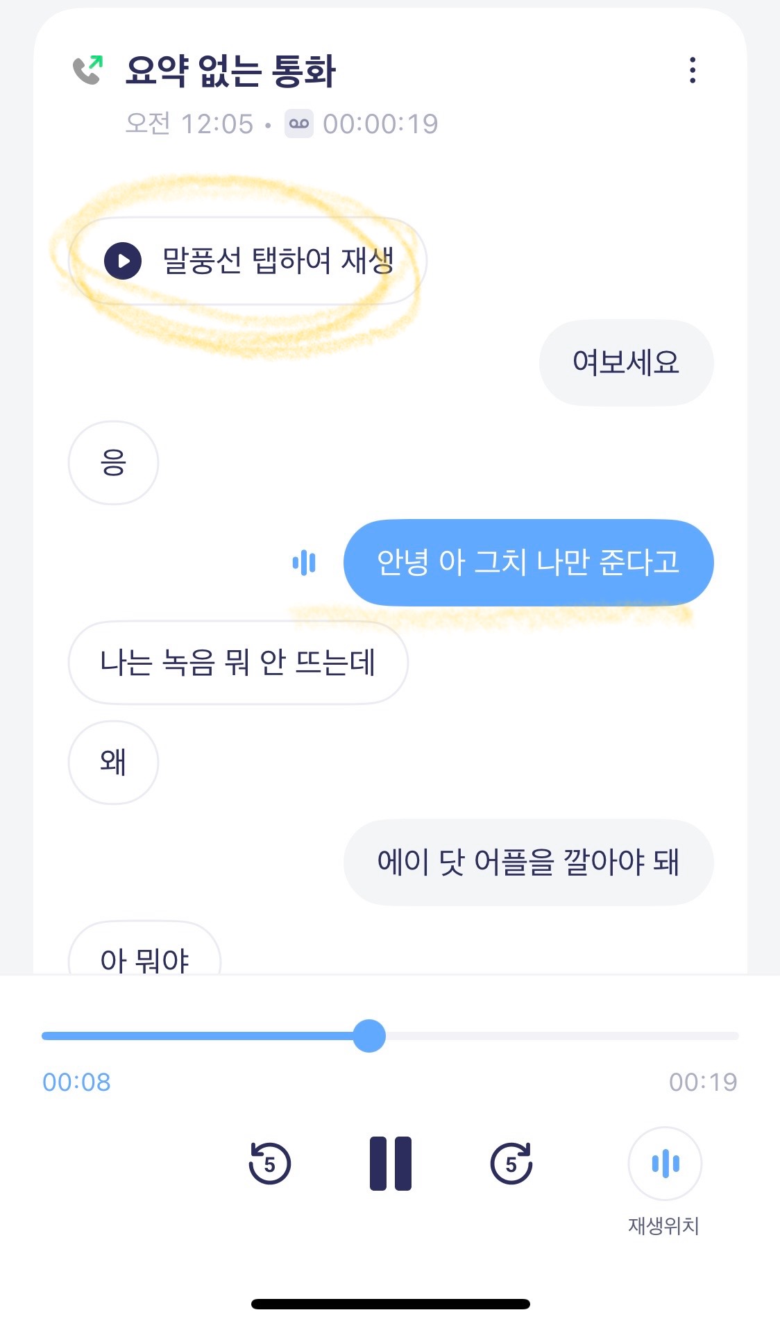 요약 없이 전체 내용도 들어보고, 대화 구간을 클릭하시면 해당 부분의 음성 녹음본을 들어볼 수 있습니다.