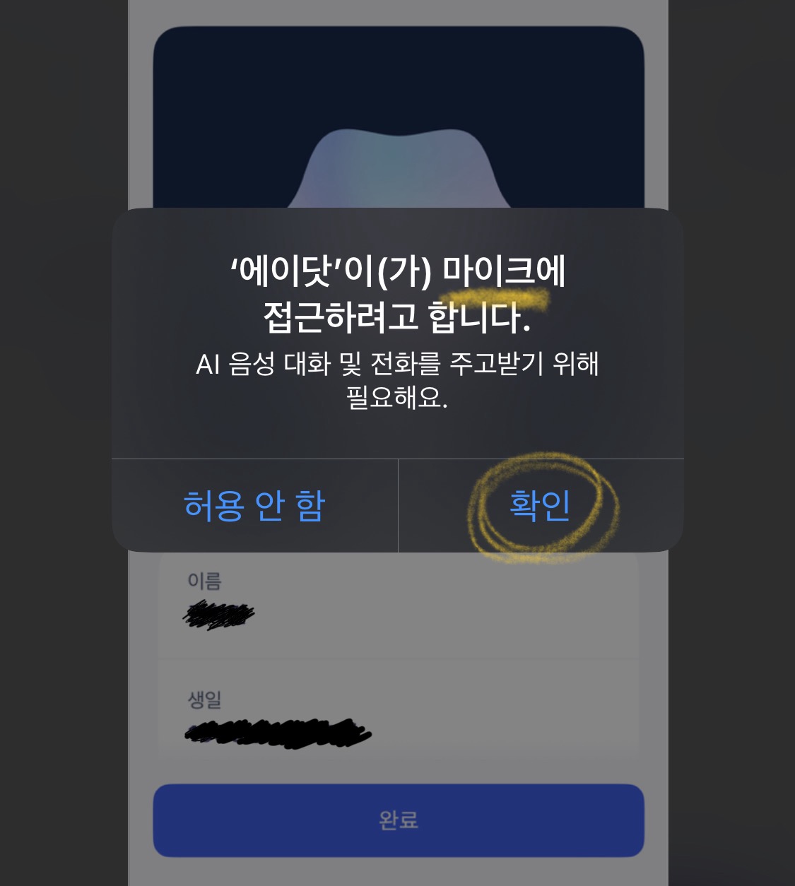 아이폰의 특성으로 여러 권한을 줘야합니다. 마이크, 연락처에 대한 접근 권한을 에이닷에 부여해줍니다.