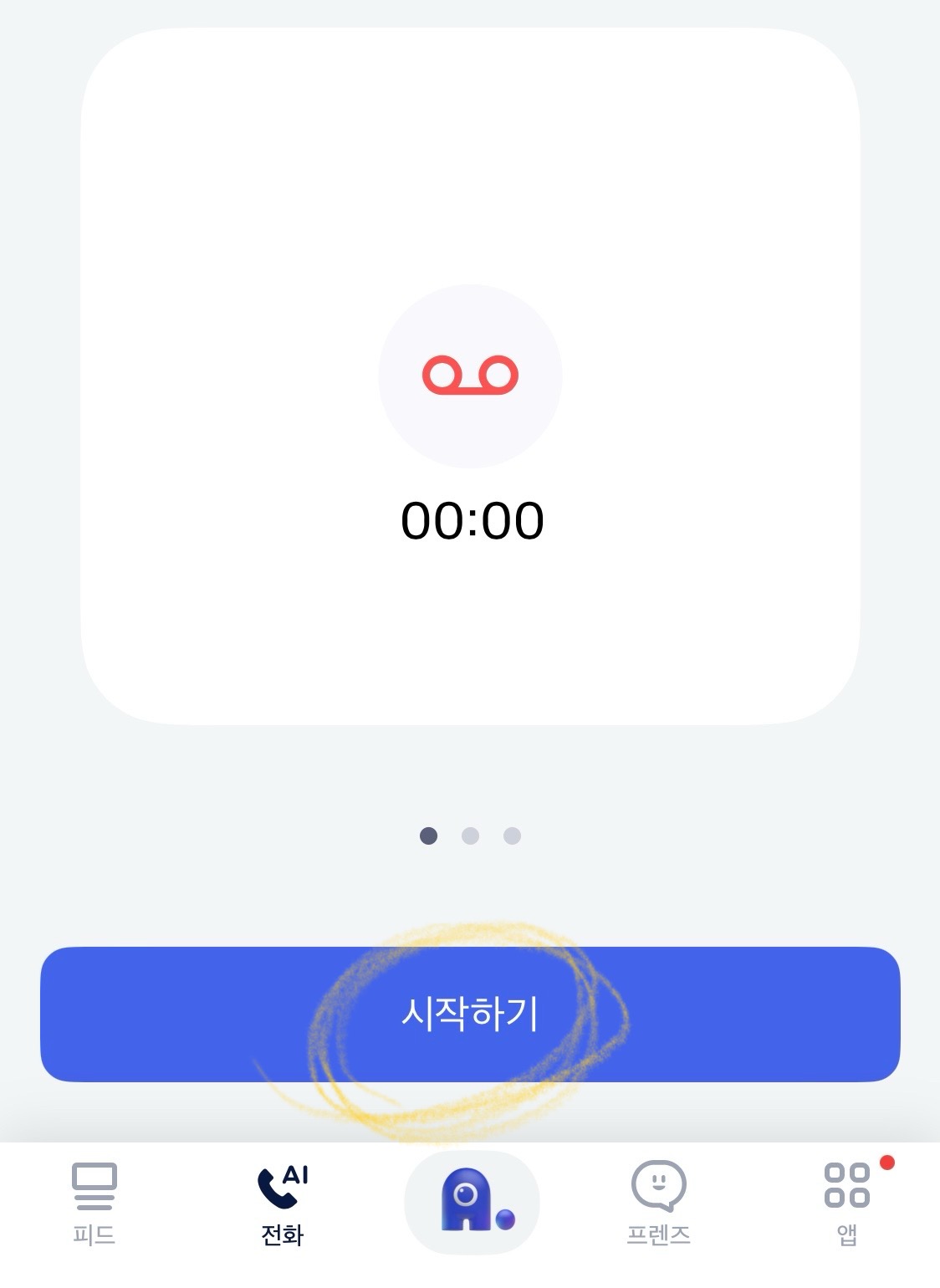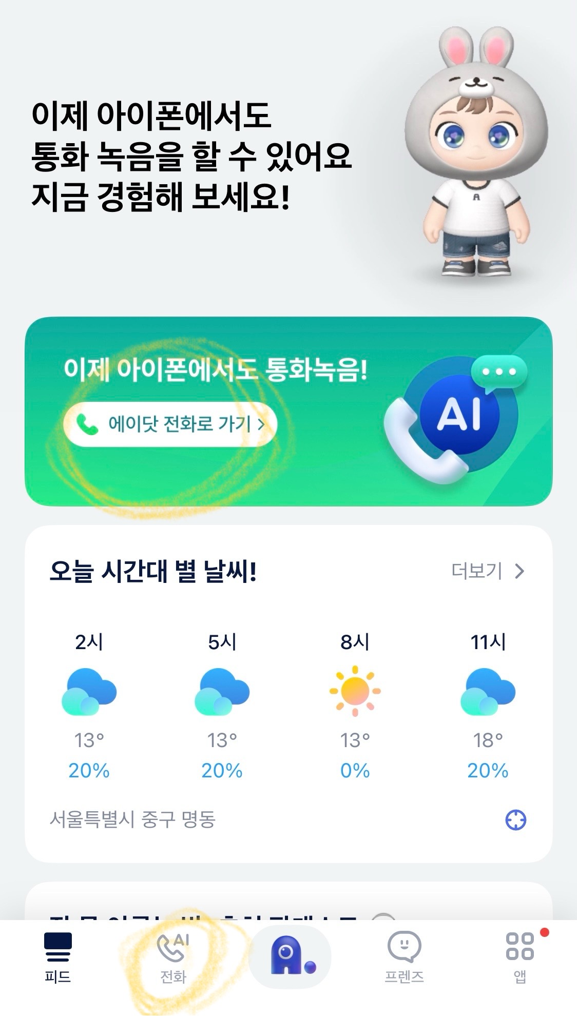 에이닷 어플 메인 페이지에서는 이미 아이폰 통화녹음 기능에 대해서 설명을 하고 있습니다. 홈화면에서도 접근이 가능하지만 아래에 AI 전화라는 버튼도 생겼습니다. 클릭해서 AI 전화로 들어가줍니다.