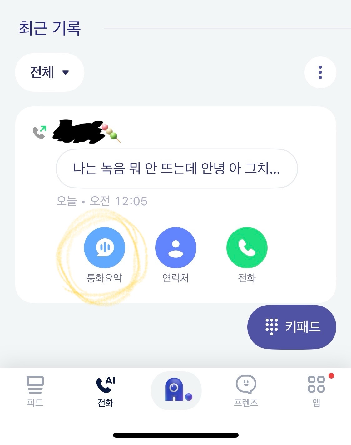이제 에이닷 어플 AI 전화에서 키패드 또는 연락처에서 원하는 사람과 전화 통화를 진행해주시면 자동으로 통화 녹음이 활성화된 채로 통화가 됩니다.