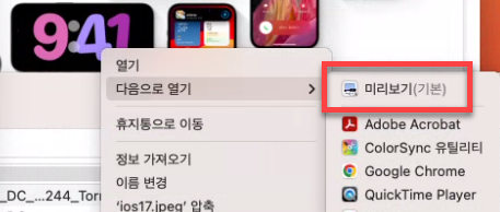 이미지에 우클릭을 하시고 다음으로 열기에서 미리보기를 클릭해줍니다. 아마 맥북에 따로 설정을 하지 않으셨다면 더블클릭을 하시기만 해줘도 미리보기 프로그램으로 열리게 될 겁니다.