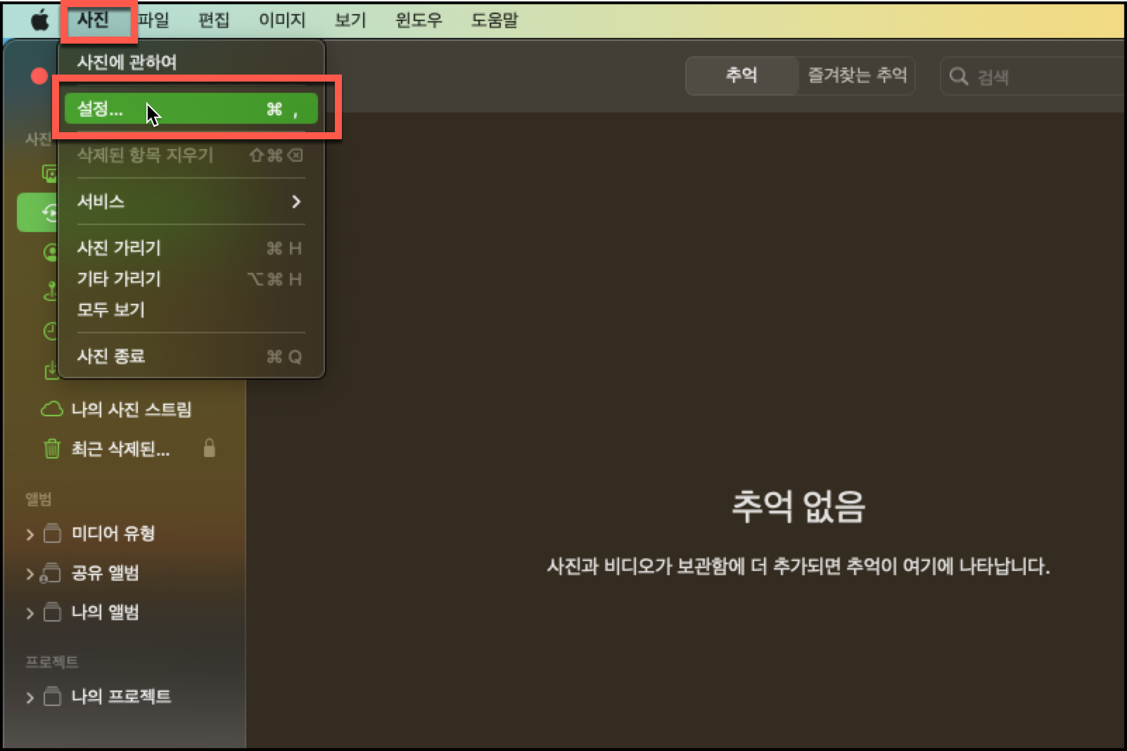 나의 사진 스트림 기능을 활성화하기 위해서 먼저 맥북에서 사진 앱을 열어서 메뉴바에 설정으로 들어가 줍니다.