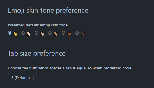 테마 색상 이외에도 이모지의 피부색, 코드의 폰트 사이즈 등을 선택할 수 있습니다.
