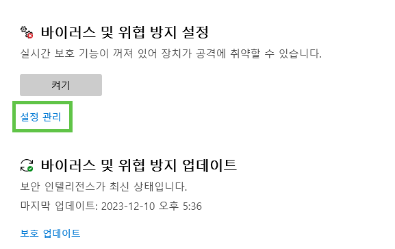 바이러스 및 위협 방지 설정에서 설정 관리로 들어가줍니다.