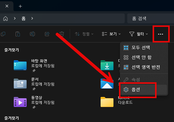 먼저 윈도우 파일 탐색기(폴더)를 하나 열어 주신 후 점 세개 더보기 버튼을 클릭해서 옵션으로 들어가줍니다.