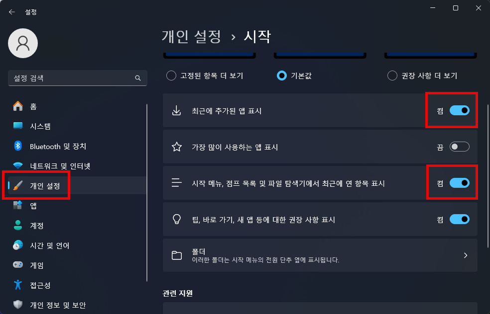 맞춤 기록을 사용하지 않게 하려면 윈도우 설정 > 개인 설정 > 시작 메뉴로 들어가줍니다.