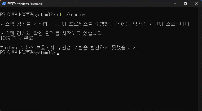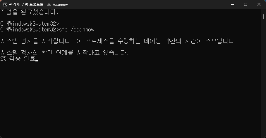 명령어를 실행하면 시스템이 손상된 파일을 검사하고 복구를 시작합니다. 이 작업은 몇 분 정도 소요될 수 있습니다.