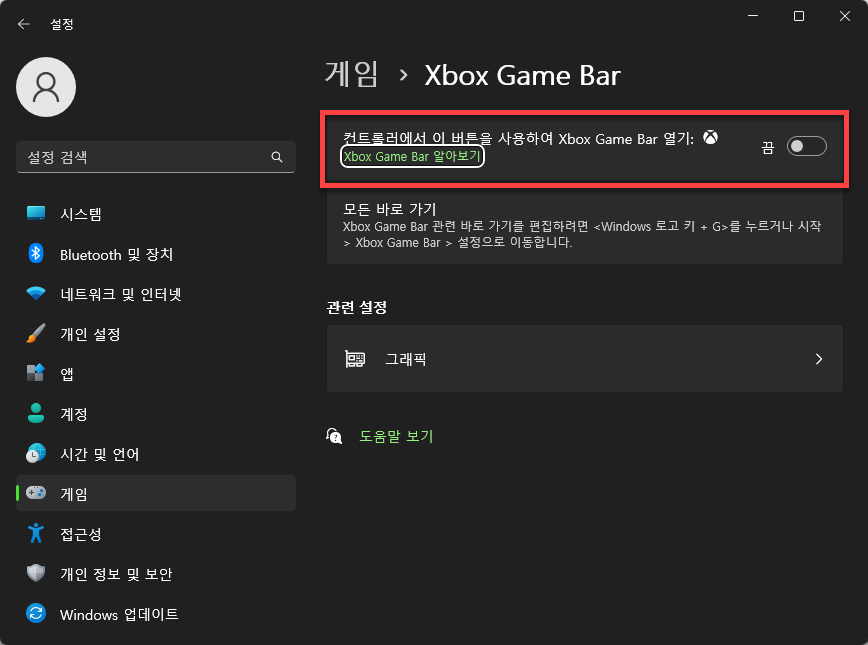 정상적인 상황이라면 컨트롤러에서 Xbox Game Bar 열기를 활성화하면 정상적으로 활성화가 되지만