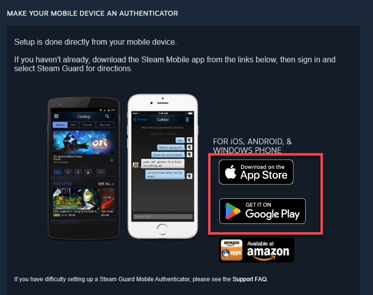 앱스토어와 구글 플레이 링크를 제공해줍니다. 클릭해서 스팀 앱을 설치해줍니다.