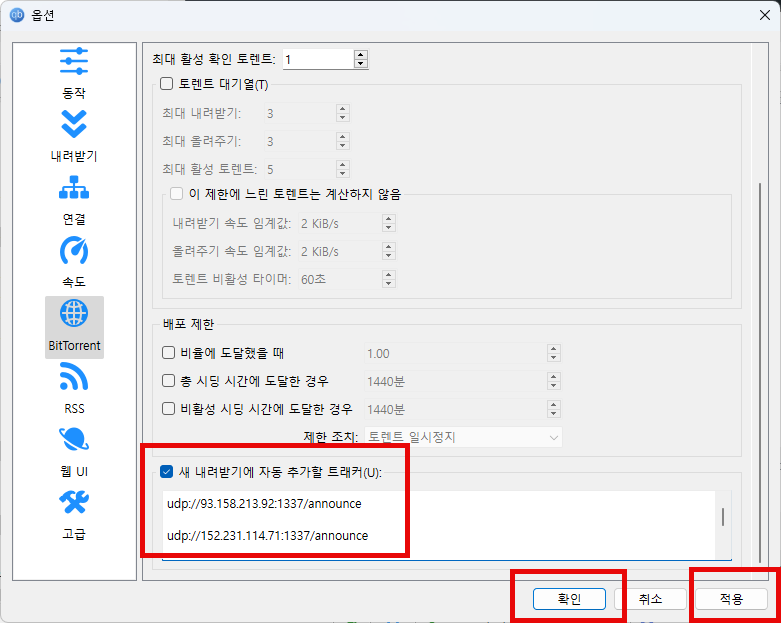 이제 여기 자동 추가를 원하는 토렌트 트래커를 입력하셔서 사용하시면 다음 토렌트 파일부터는 트래커가 자동으로 추가됩니다. 적용하고 확인을 클릭해서 나와줍니다.