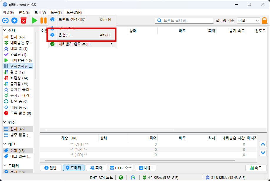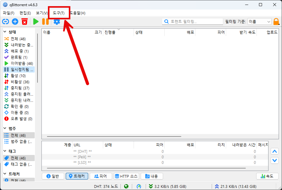 qbittorrent를 먼저 켜주신 다음 [도구] 탭을 클릭해줍니다.