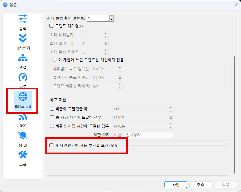 왼쪽 메뉴바에 BitTorrent를 클릭해서 제일 아래에 [새 내려받기에 자동 추가할 트래커] 버튼 박스를 체크해서 활성화 해줍니다.