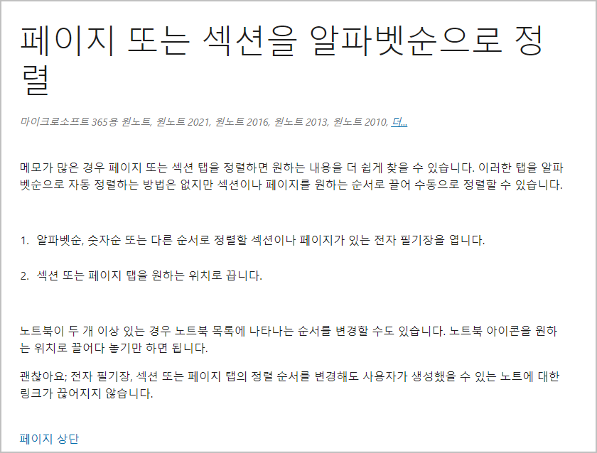 결론 : 원노트에서는 아직 섹션 정렬은 지원하지 않고 페이지 정렬 기능만 지원한다.