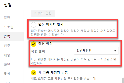 멘션 알림을 일반채팅 또는 오픈채팅을 선택해서 알림을 받을 수 있습니다.