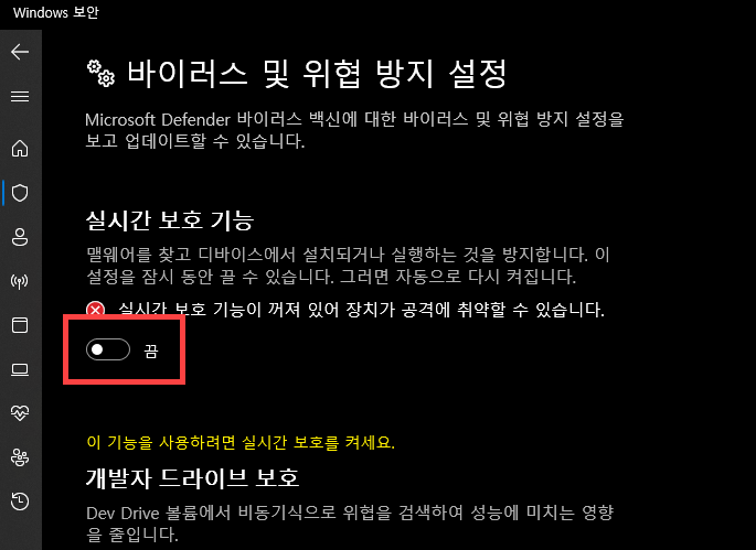실시간 보호 기능이 켜져 있을 겁니다. 버튼을 클릭해서 끔 상태로 변경해줍니다.