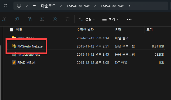 이 중 [KMSAuto Net.exe] 파일을 더블클릭해서 실행해줍니다.
