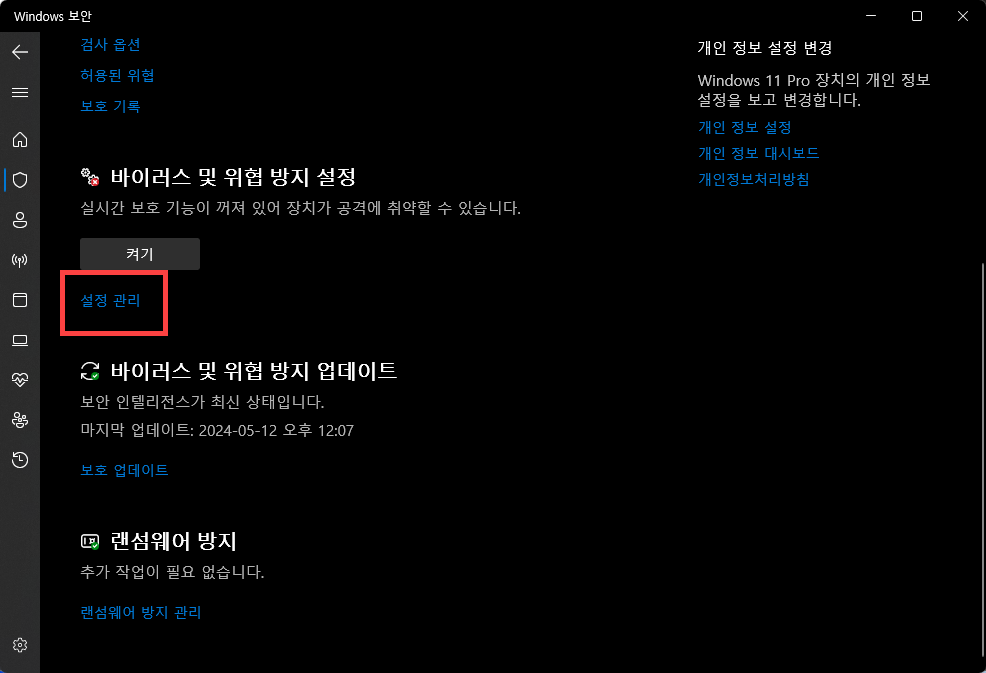 바이러스 및 위협 방지 설정에서 [설정 관리]를 클릭해줍니다.