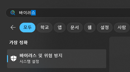 윈도우 검색에 바이러스라고 검색을 해줘서 [바이러스 및 위협 방지]를 클릭해서 제어판을 열어줍니다.