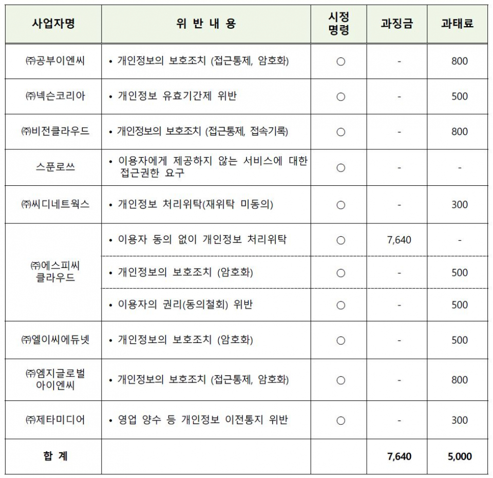 위반 업체는 △공부이엔씨 △넥슨코리아 △비전클라우드 △스푼로쓰 △씨디네트웍스 △에스피씨 클라우드 △엘이씨에듀넷 △엠지글로벌 아이엔씨 △제타미디어 등이다.