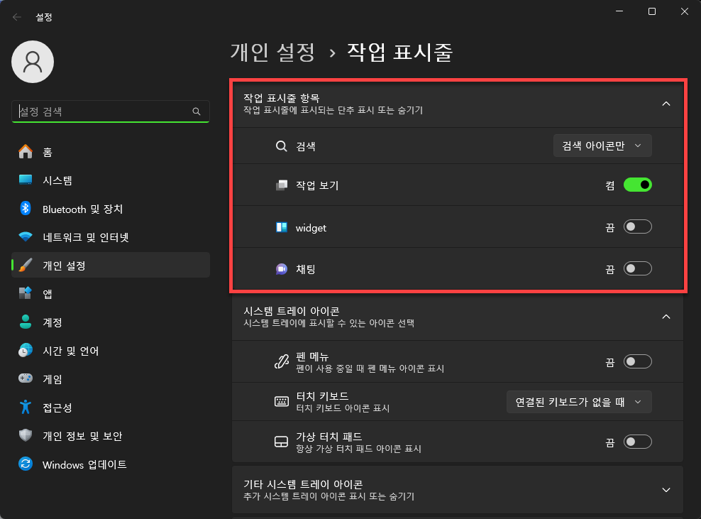 윈도우 설정에서 개인 설정 > 작업 표시줄 설정으로 들어가 보시면 작업 표시줄에 표시되는 항목들이 나타나게 됩니다.