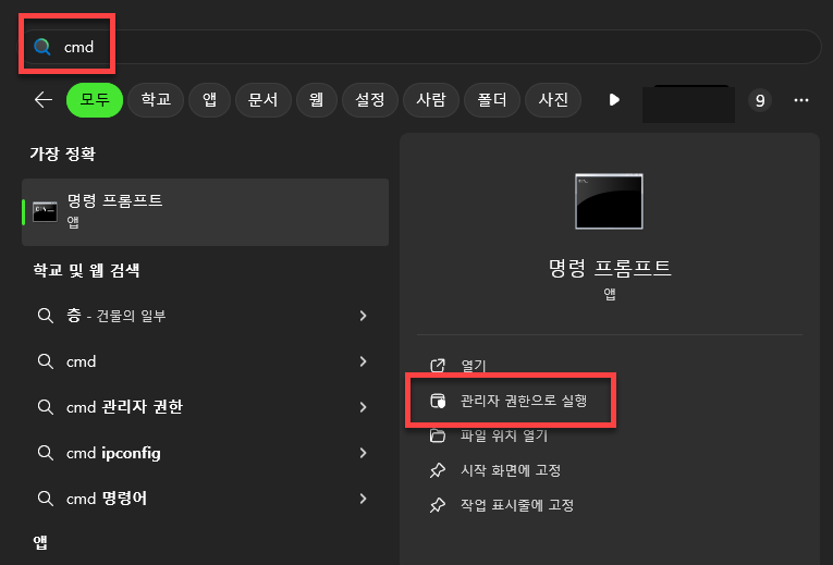 cmd 또한 관리자 권한으로 실행해 줍니다.