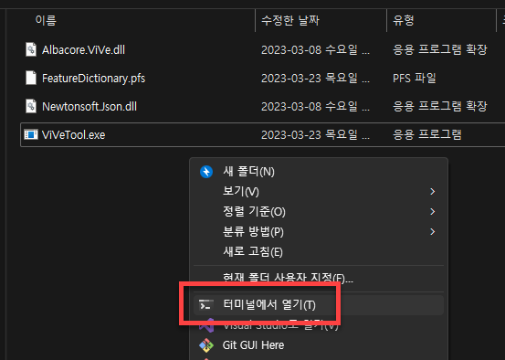 ViVeTool.exe에 마우스 우클릭을 하신 후 Ctrl+Shift를 누른 채로 터미널에서 열기를 클릭하시면, 관리자 권한으로 터미널을 열 수 있습니다.