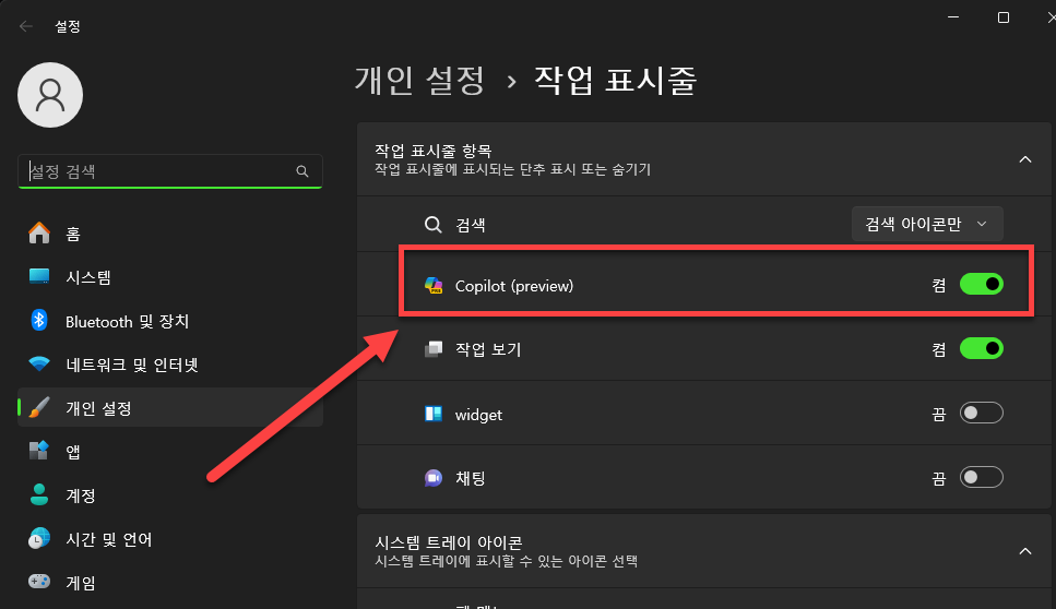원래는 여기 Copilot이 있어서 켬으로 바꾸면 작업 표시줄에서 선택해서 바로 사용이 가능했었습니다.