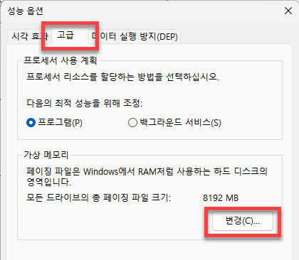 성능옵션 > 고급 탭에서 가상 메모리 변경을 클릭합니다.