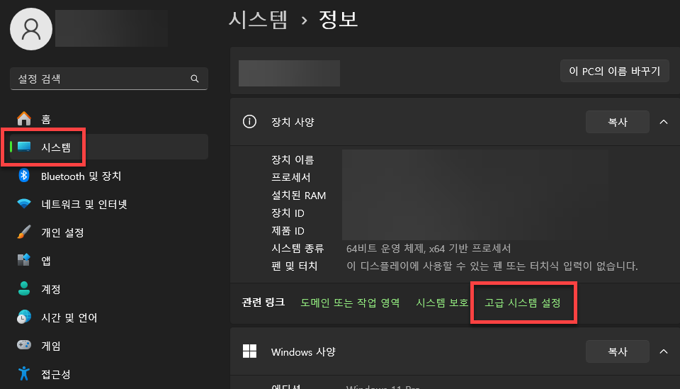 장치의 사양이 나타나 있는 곳 아래에 [고급 시스템 설정] 으로 들어갑니다.