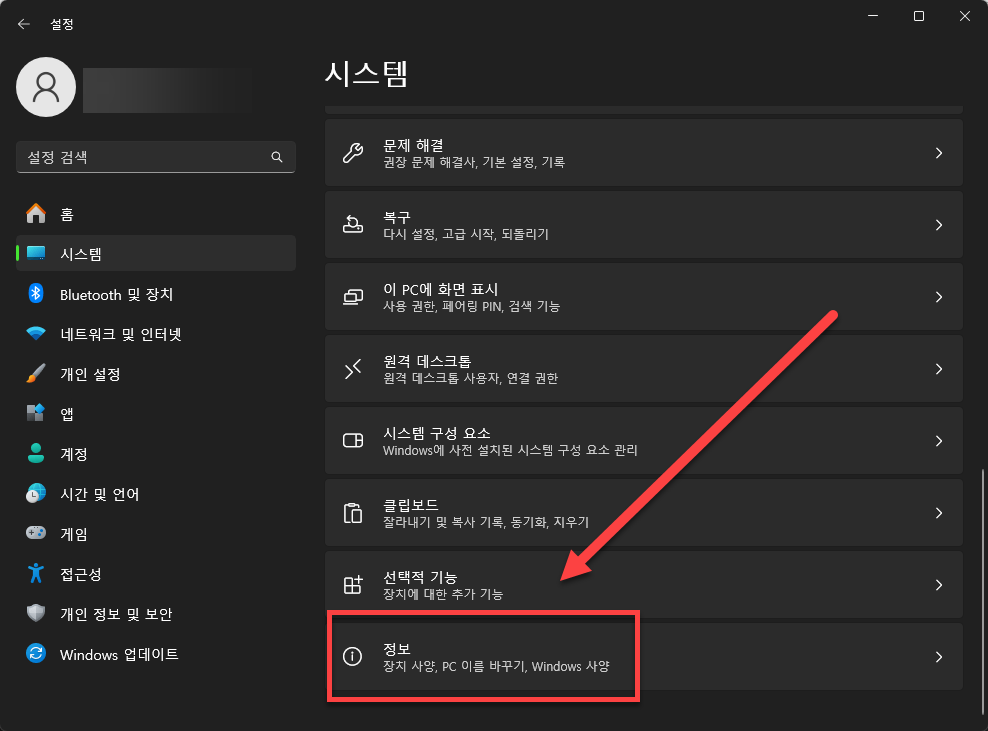 시스템 메뉴 안에 맨 아래에 보시면 정보를 클릭해 줍니다.