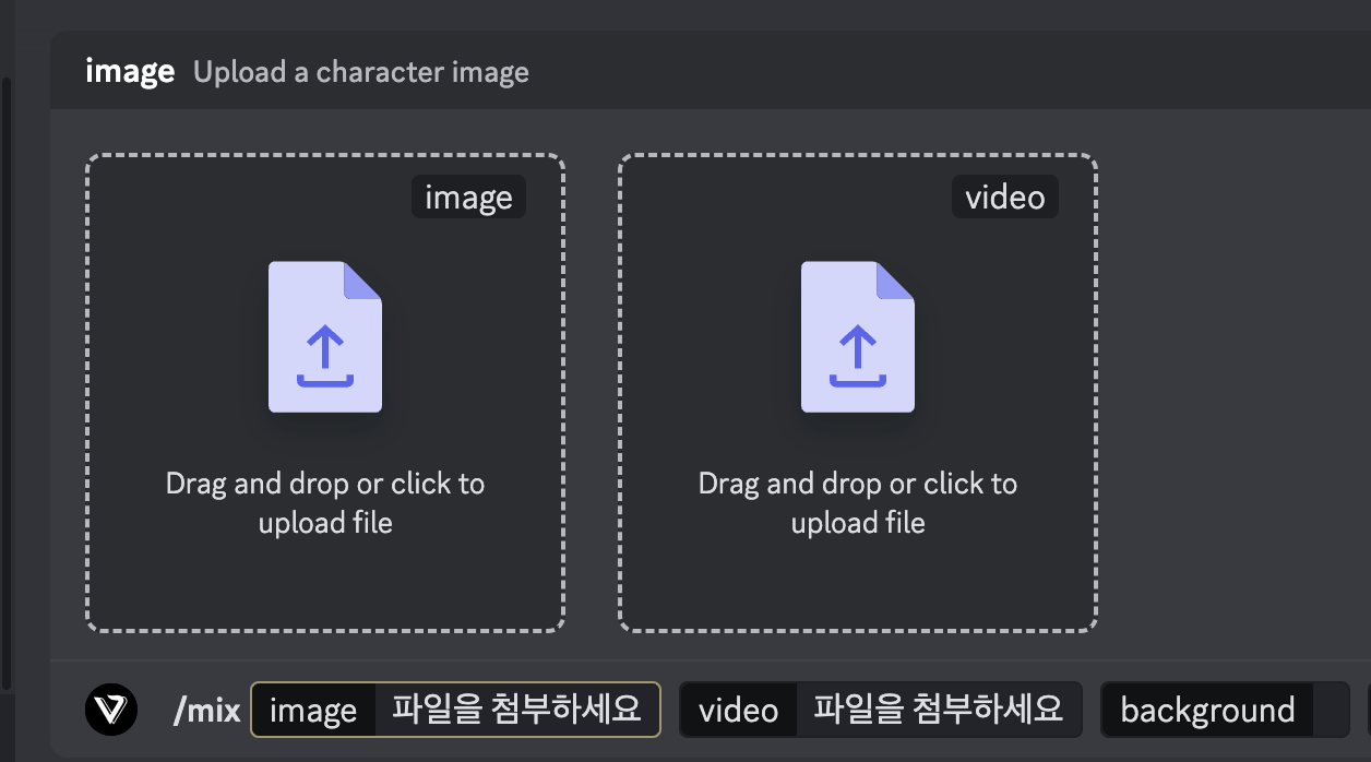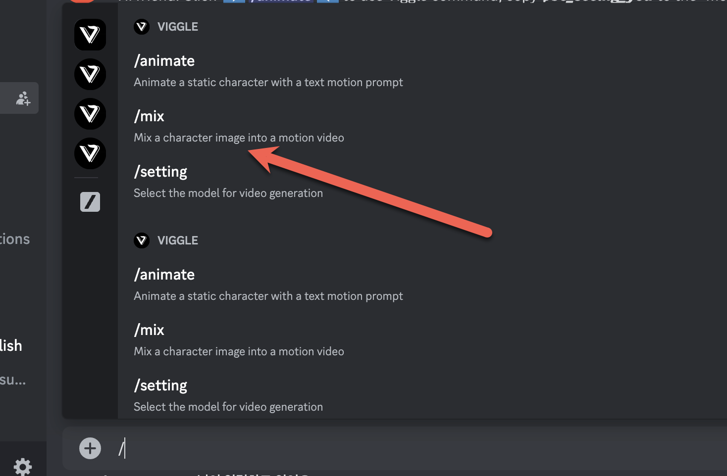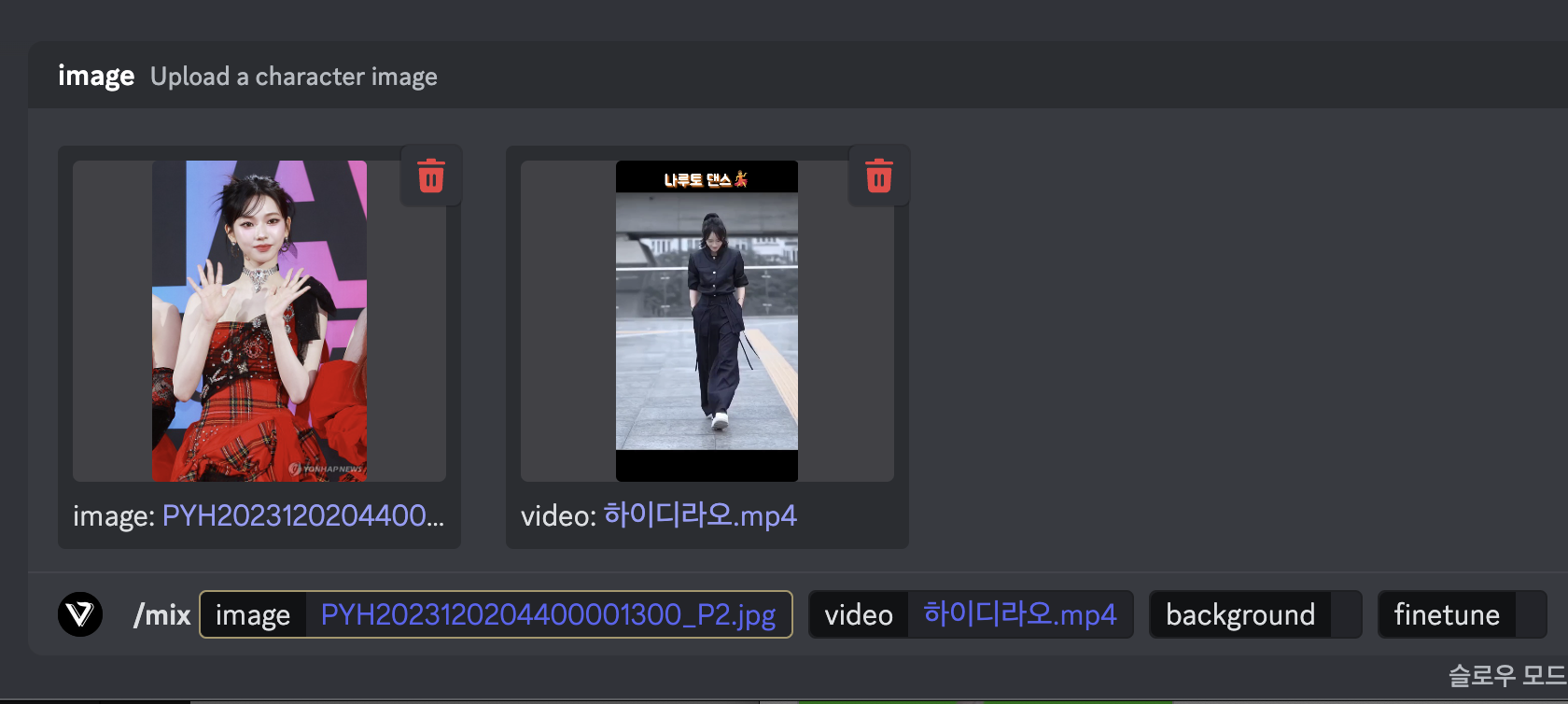 검색어에 /를 입력해 보시면 사용 가능한 명령어들 목록이 나타나게 됩니다. 여기서 사진과 춤추는 영상을 가지고 AI 춤추는 영상을 만들어주는 명령어는 /mix입니다.