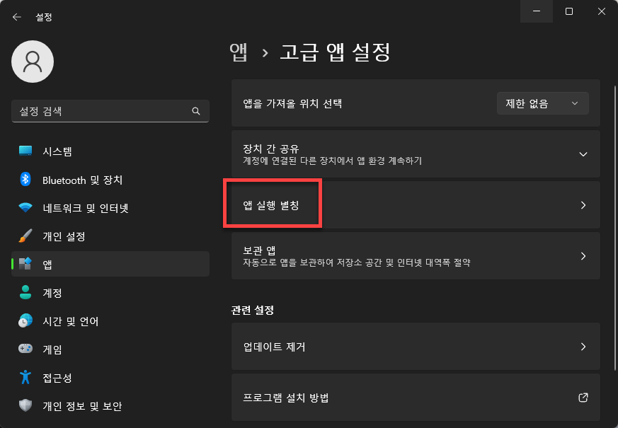 제어판의 앱> 고급 앱 설정으로 들어가 주신 후 [앱 실행 별칭]을 클릭해줍니다.