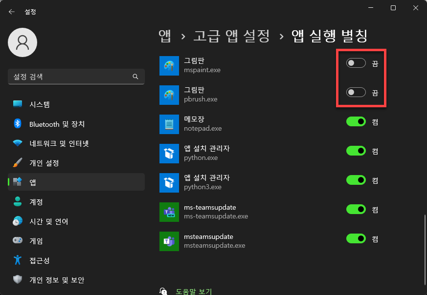 그러면 mspaint.exe와 pbrush.exe가 앱 실행 별칭 쪽에 있는 것을 확인하실 수 있는데