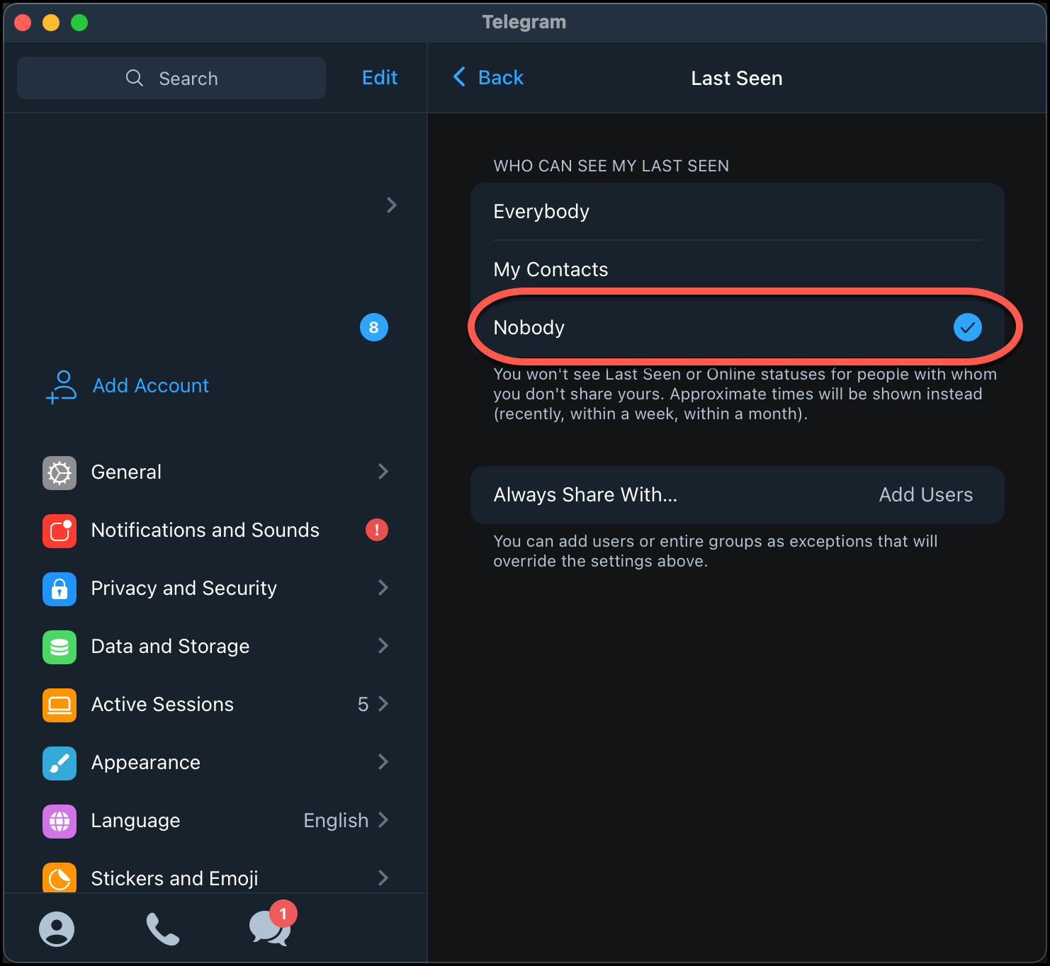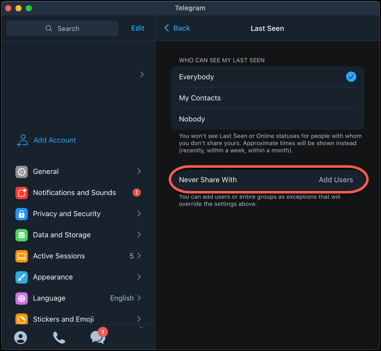 텔레그램 마지막 접속시간 last seen 비공개 설정 방법