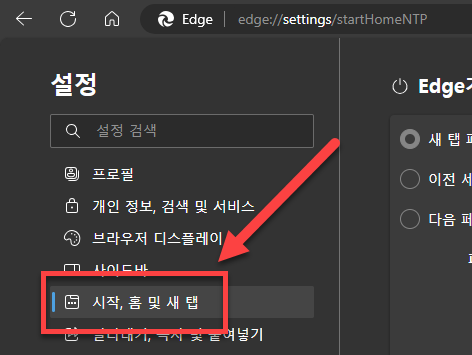 왼쪽 설정에서 [시작, 홈 및 새 탭]으로 들어갑니다.