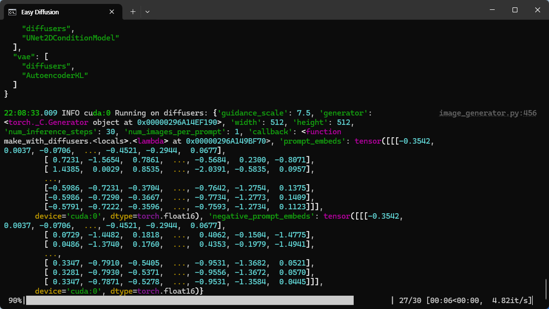 Easy Diffusion에서는 터미널도 함께 실행히 되는데, 여기서 내가 요청한 AI 이미지가 어떤식으로 만들어지는지 직관적으로 확인하실 수 있습니다. 30단계로 요청을 했는데 단계를 높일수록 더 세밀하게 그림을 그려줍니다.