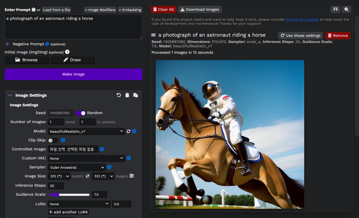 그러면 프로그램이 알아서 간편하게 AI 이미지를 만들 수 있는 환경을 만들어 줍니다.