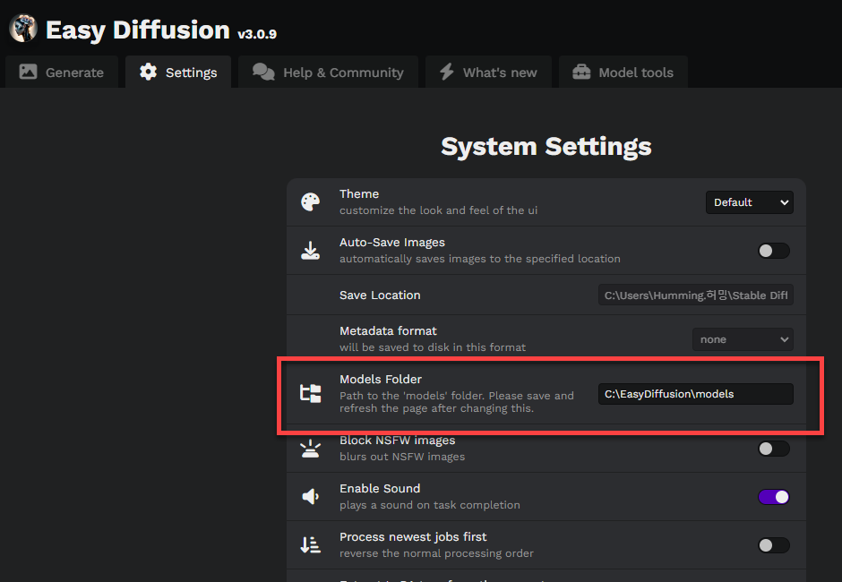 Settings 메뉴에서 Models Folder에 내가 다운로드한 모델 파일을 넣어주시면 사용이 가능합니다.
