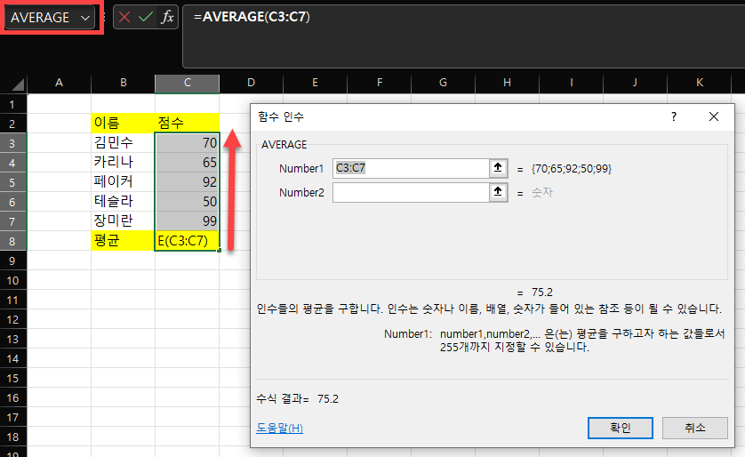 왼쪽에 함수 부분에 AVERAGE를 선택해주시면 함수 인수를 입력할 부분이 나옵니다.