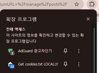- 브라우저 우측 상단에 퍼즐 모양의 아이콘을 클릭하시면 확장 프로그램들을 볼 수 있습니다. 여기서 보이는 내가 원하지 않았던 프로그램이나 인터넷에 영향도를 줄만한 프로그램이 있는지 찾아서 비활성화 해줍니다.